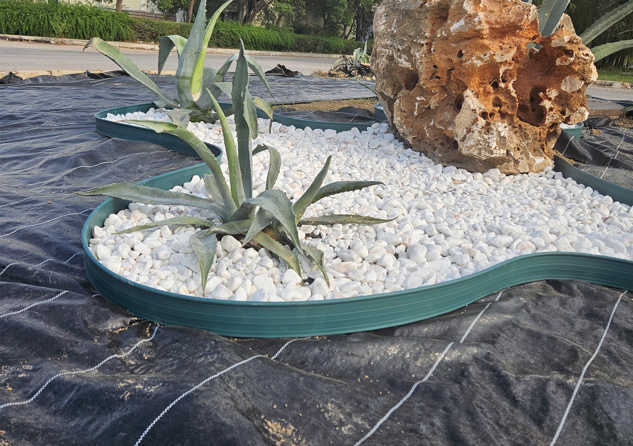 Son olarak kumaşın üzerine istenilen kalınlıkta dolamit taş, çakıl veya dekoratif malzeme serilerek uygulama tamamlanır.